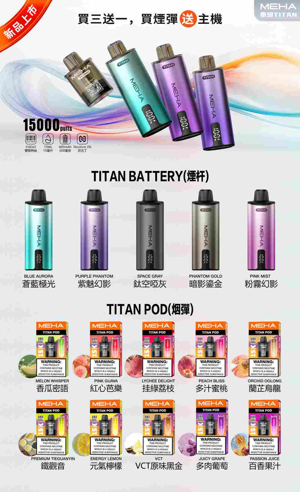 泰坦TITAN15000,是性能、口感與設計的巔峰之作。它不僅擁有15,000口的超長壽命與600mAh大電池作為強大後盾,更以雙發霧化芯和19W強勁功率帶來真實還原且爆發力十足的震撼口感。再加上金屬機身的奢華質感、圓潤手持感、Type-C快充與電量顯示屏的智慧便利,為您提供無可挑剔的全方位體驗。